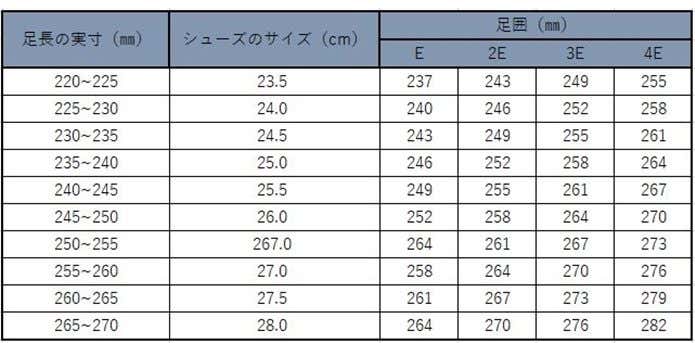 親指根元と小指根元の、最もふくらんでいる部分をぐるりと測った長さ。このことを足囲(そくい/ワイズ)といいます。日本人は一般的に足の幅が広いとされていますので、海外のシューズだと狭さを感じる人もいます。ここで、幅広モデルの登場です。靴の表記でよく見る「4E」や「5E」はこの幅の広さを表すもので、数字が大きいほど広くなります。