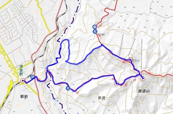 眺めのいい飯盛山と2つの滝を見られるコースです。清里駅を出発して、まずは「千ヶ滝」を見に向かいます。小さな滝ですが間近で見られるので登山口に行く前に寄ってみてください。平沢の駐車場からはゆるやかに林の中を進みます。道の途中からは展望が開けてくるので、周りの景色を楽しみながら登りましょう。平沢から1時間半弱で山頂に到着します。