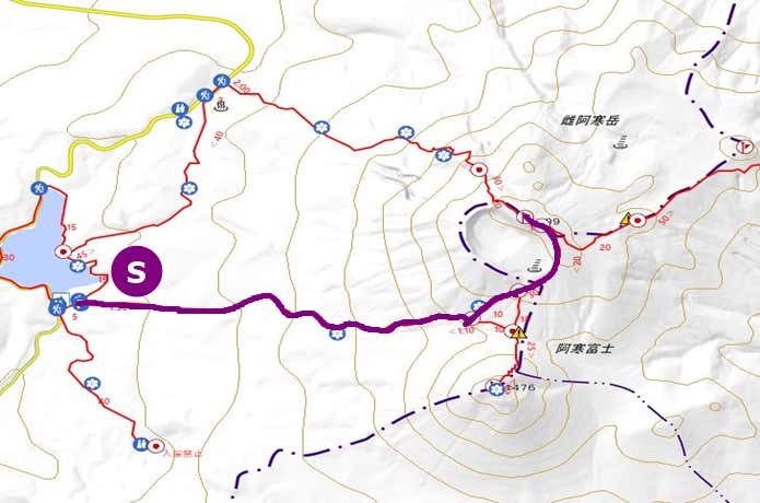 雌阿寒温泉登山口(30分)→二合目(40分)→五合目(45分)→八合目(25分)→雌阿寒岳(15分)→八合目(25分)→五合目(20分)→二合目(20分)→雌阿寒温泉登山口
