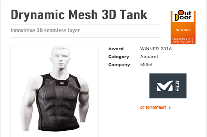 世界90カ国以上から集まるドイツのアウトドア製品展示会「OutDoor Friedrichshafen2016」で、 世界中の最新アウトドア製品343点の中から、37点に授与された賞で、ミレーの「ドライナミック™ メッシュ」は、その革新性が評価され受賞することができました。