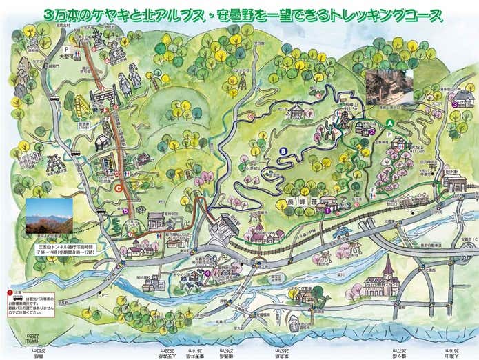 JR篠ノ井線田沢駅を起点に光城山と長峰山を登り、明科駅へ下山する道順となります。安曇野の町や田園風景、背後に聳える北アルプスの山々を一望できるハイキングコースです。光城山も長峰山も山頂の展望が開けているので、眺めは最高ですよ!