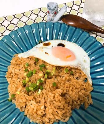 ⑤ご飯を器に盛り、上に目玉焼きを乗せて完成!仕上げに刻みネギをかけて仕上げです