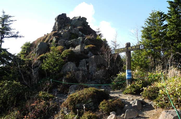 ややきつい斜面を乗り越えると四阿山の山頂に到着します。山頂からは浅間山や草津白根山といった山々を一望できます。