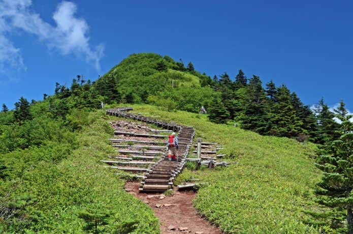 「パルコール嬬恋スキーリゾート」のゴンドラを利用することで、一気に稜線まで上がることができるので、初心者でも簡単に四阿山山頂まで登れます。木道や木段が整備されているため、安心して歩けます。