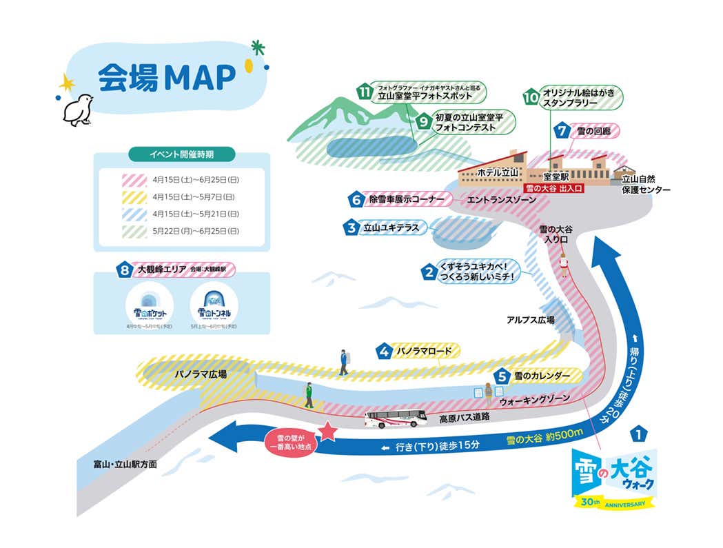 冬の間は雪が深すぎるため閉鎖される立山黒部アルペンルートですが、春~初夏にかけて、ルートの一部で「立山黒部 雪の大谷フェスティバル」が開催されます。「立山黒部・雪の大谷フェスティバル」は、高いところで20mにも及ぶ雪壁の迫力を間近に体験できるため、国内のみならず海外からの観光客も多く、大変人気のあるイベントです。