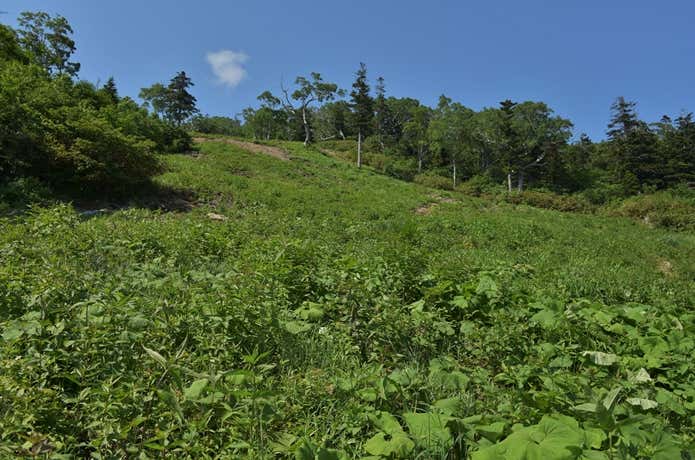 ゴンドラ山頂駅からスキー場ゲレンデの急登をしばらく登り、樹林に囲まれた細い登山道へ。ここから先も急登が続きます。斜面を登りきると展望の開けた稜線となり、西大巓の山頂に到着です。