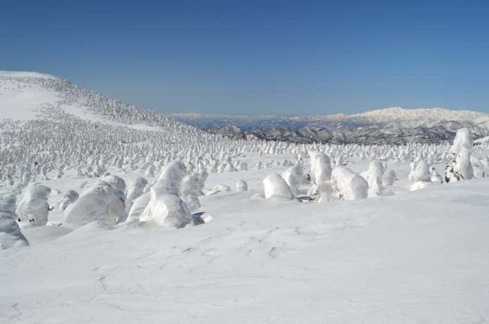 亜高山帯に分布する針葉樹に氷や雪が付着し雪だるま状に大きくなる「樹氷」。スノーモンスターとも呼ばれ国内でも限られた場所でしか見ることができません。冬季(1月~3月上旬)の吾妻山では、稜線上にたくさんの樹氷が広がることでも有名。
