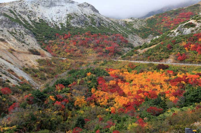 吾妻山の東側を縫うように走る磐梯吾妻スカイラインも紅葉の名所として有名。全長28.7㎞の山岳観光道路には、作家・井上靖が選出した景勝地「吾妻八景」が点在し、つばくろ谷や天狗の庭から紅葉を楽しむことができます。10月上~中旬が見頃です。