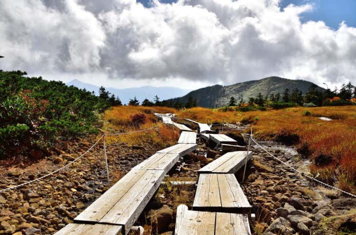 北望台からは中大巓分岐方面へ。北望台からしばらくは樹林帯を歩きます。足元には大きな石が多いので、注意して進みましょう。樹林帯が終わり分岐を南へ進むと、一面の湿原とそこに伸びる木道が。チングルマやイワカガミなど、さまざまなお花が楽しめます。