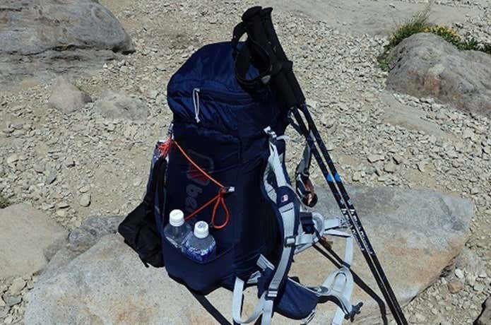 「ドリンク」「食料」「行動食」を入れる場合、「ドリンク」は500mLペットボトルを3本、両側サイドポケットに入れます。