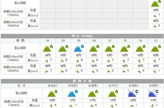 たとえば8月4日からの土日を使って1泊2日で登山を予定していたとすると、2日目の登山指数がB。「やや登山には適していない」という結果です。山頂付近の風速が、注意が必要な数字を表す赤色で表示されています。