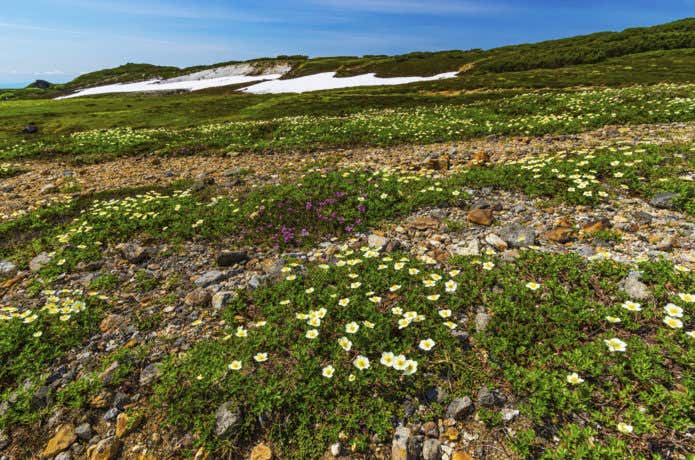 7月初旬まで雪が残る事もあり、夏でも涼しく快適に登山ができる旭岳。高山植物のハイシーズンでもある夏には、可愛らしい姿のチングルマや薄紫が特徴のイワブクロ、鮮やかな青紫色のミヤマリンドウなど、多くの植物が一面に咲き乱れます。