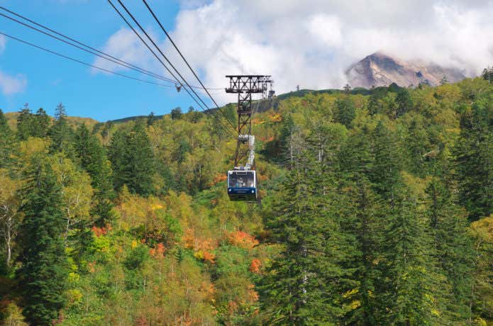 旭岳ロープウェイは旭岳の麓、標高1,100mにある旭岳温泉のある山麓駅から、標高1,600m・5合目にある姿見駅までを結んでいます。路線距離は、2.36km。夏場は15分間隔で運行し、冬は20分間隔で運行しています。一度に101人まで乗車可能。ロープウェイの車内では観光アナウンスが流れ、周囲の山々の情報を教えてくれます。