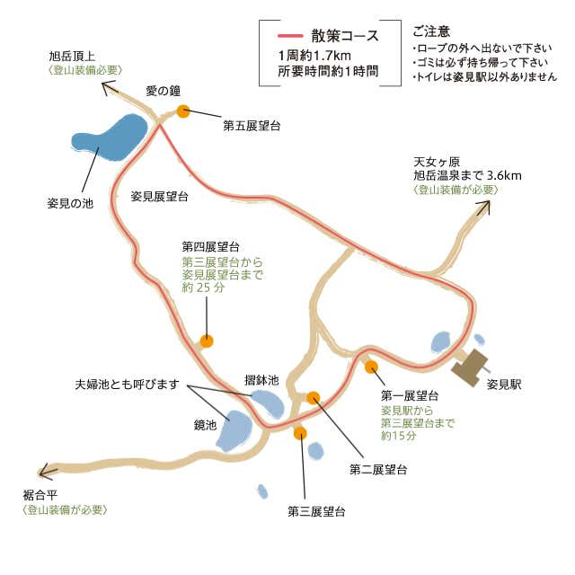 姿見(20分)→姿見の池(2時間30分)→旭岳(1時間50分)→姿見の池(15分)→姿見