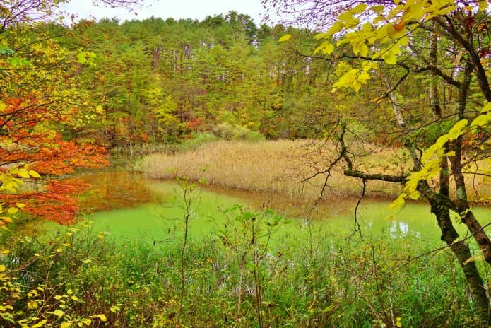 紅葉の季節は、周辺に群生する葦の花の時期でもあります。沼の中心は緑色で岸に近づくにつれ赤色に変化する様は、まるで絵画のようでフォトジェニック!