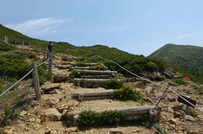五合目小屋を越えると森林限界に。一気に景色が開けてきます。馬の背までは急登の険しい岩道。こまめに休憩しながら進みましょう。