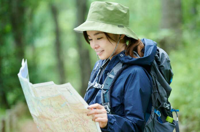 歩くときは両手が空いていたほうが安全なので、持ち物はリュックに入れるのがおすすめ。登山用でなくても良いですが、ショルダー部分にクッション性があったり腰ベルトがついていると、より快適に歩くことができます。ショルダーバッグは片側に負担がかかり疲れやすいため不向き。