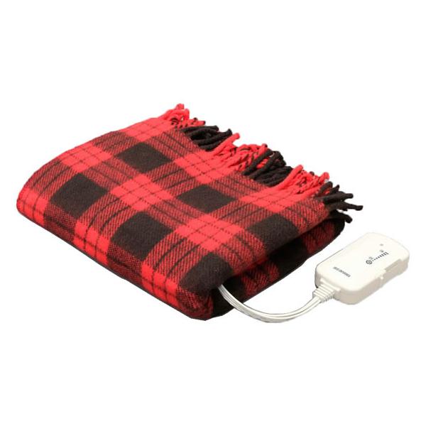 おしゃれな赤のチェック柄のブランケット。ひざ掛けはもちろん、羽織ったり、敷いて座ったりと、幅広い使い方が可能。温度は無段階調整タイプで、好みに合わせて自由にセットできます。