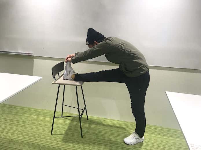 脚を持ち上げる動作には、大腿後部の筋肉も大きく働きます。このストレッチで大腿後部をしっかりと伸ばしましょう。