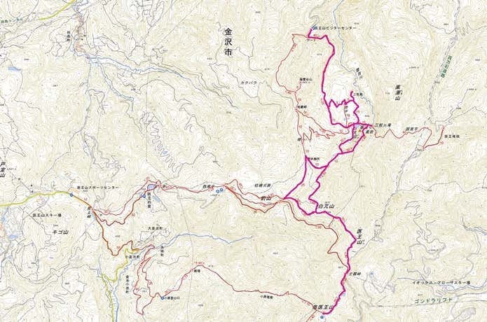 医王山ビジターセンター(55分)→大池平(10分)→三蛇ヶ滝(90分)→白兀山(60分)→奥医王山(105分)→覗休憩所(55分)→三色泉(45分)→医王山ビジターセンター