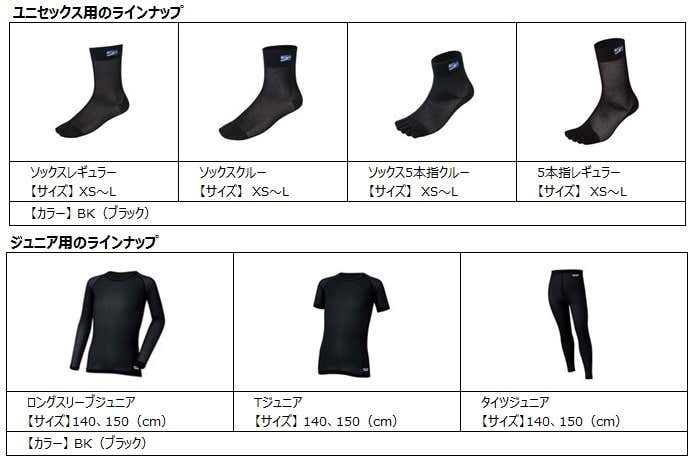ドライレイヤーの”スキンメッシュ、パワーメッシュ、アクティブスキン”のユニセックスアイテムでは、それぞれ特有な商品をそろえています。スキンメッシュはインナーソックスを中心に、ジュニア用も展開。