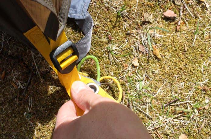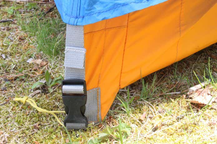 レインフライは本体のバックルと連結させる構造に。パチっとバックルに押し込めば、あとはアジャスターを引いて調整するだけ! 設営がとにかく簡単でスピーディーでした。