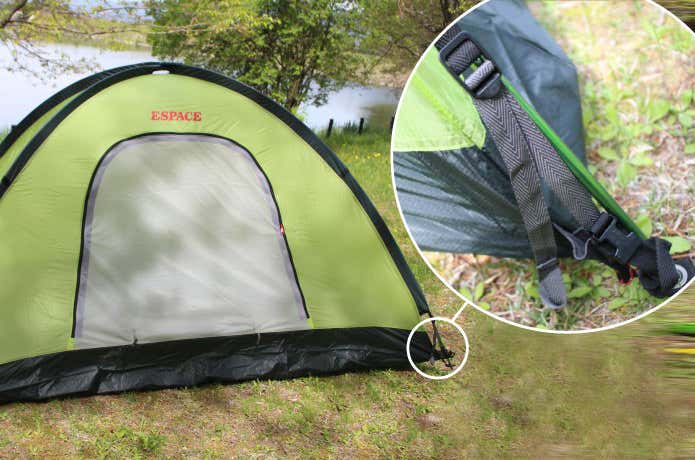 本体の収納袋背面付いているベルトは、ポールと合わせて無駄なく圧縮することが可能。軽量かつコンパクトで、持ち運びもストレスがなさそうです!