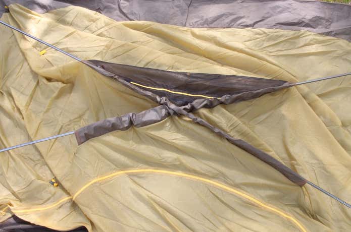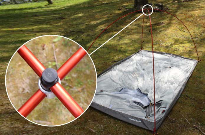 アトム2Pは、まず2本のポールを天井部のスリーブ内にクロスさせるように入れた後、その四隅側をフックで留める設計になっています。スリーブは大きな作りになっているので、ストレスなくサッと入れることができました。