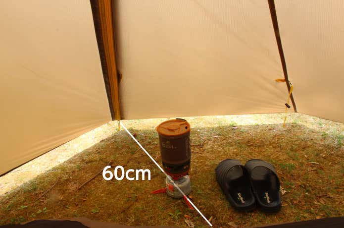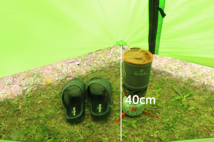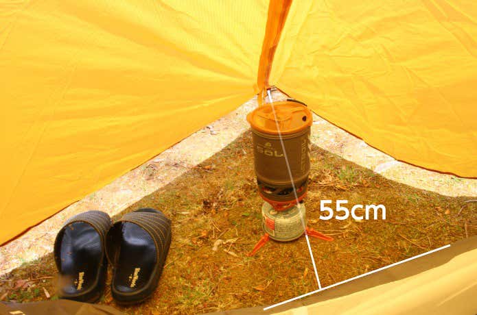 短辺入口のため前室は狭めですが、奥行があるので使いやすい印象でした。不要な荷物を置けるスペースが充分に確保されています。火器を使用するにはやや高さが低いので注意が必要。