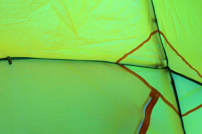 本体がオレンジ色、フライシートが青色という濃い色の組み合わせのせいか、室内が薄暗く印象を受けました。その反面、眩しい日光やヘッドライトの明かりを遮断できたり、ランタンをつけた際に透けにくいというメリットも。