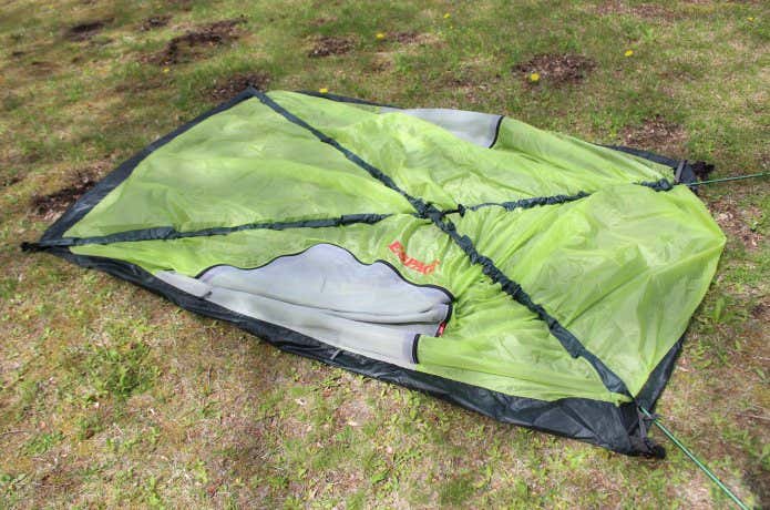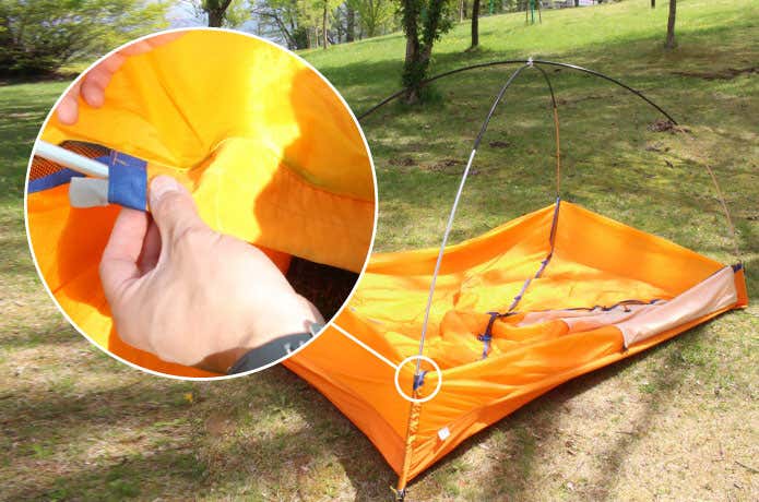 本体の自立はポールを袋とじ状になったスリーブに先端まで押し込んだ後、前面のみ金属部分の穴に差し込む構造になっています。一人でもストレスなく簡単に立てることができました。