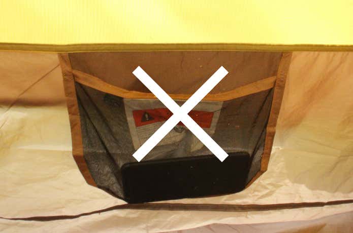 このデュオアルティメイトには室内のポケットが付いていません。筆者はポケットに腕時計やテントの袋などを入れておくことが多いので、ちょっと不便に感じました。小物などは別で入れ物を用意しておく必要がありそうですね。