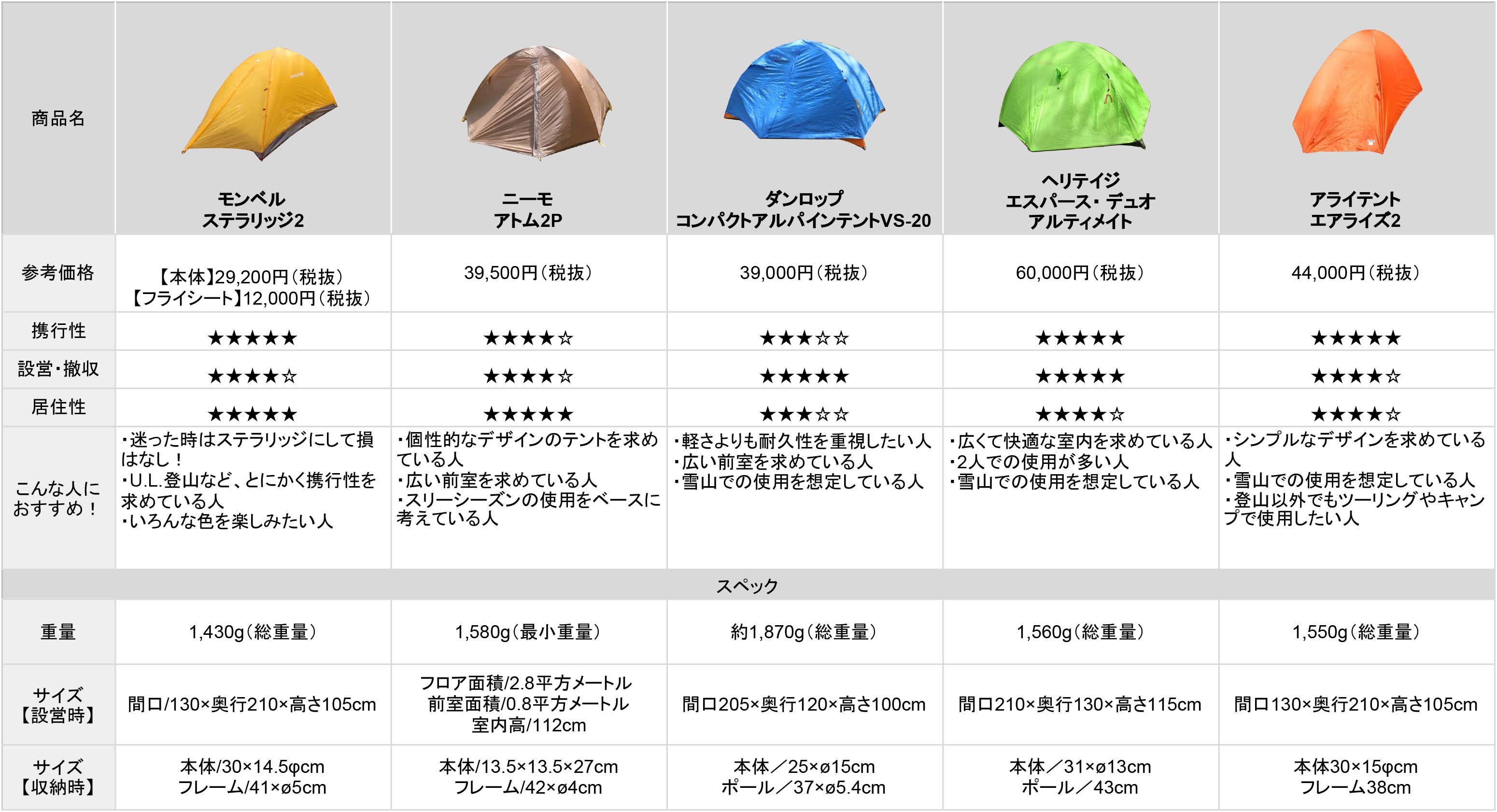 今回は、はじめてのテント泊におすすめの「2人用のダブルウォールテント」の中から、登山仲間やショップで勧められることも多い人気モデル5種をピックアップ。実際に設営して、使い勝手を検証してみました!