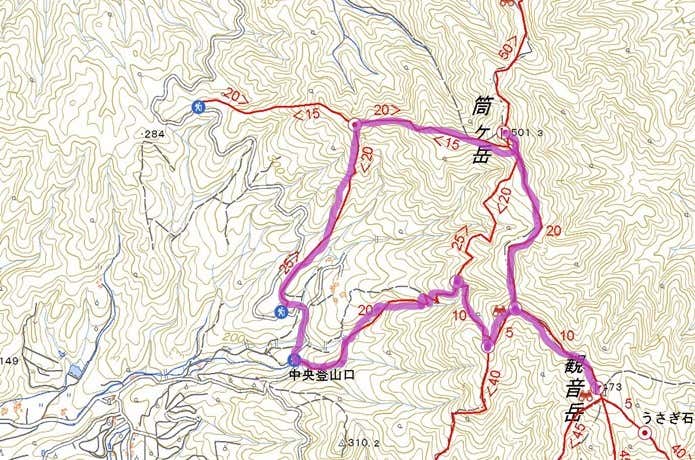 中央登山口(60分)→筒ヶ岳(40分)→観音岳(30分)→中央登山口
