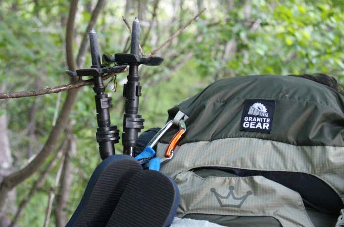 ※)今回の検証では、トレッキングポールの引っかかり具合を確かめるために、ザックの高さを超える位置にポールを取り付けています。
