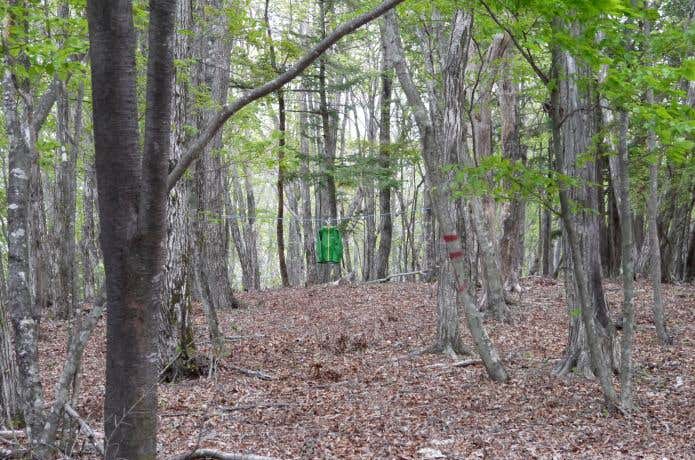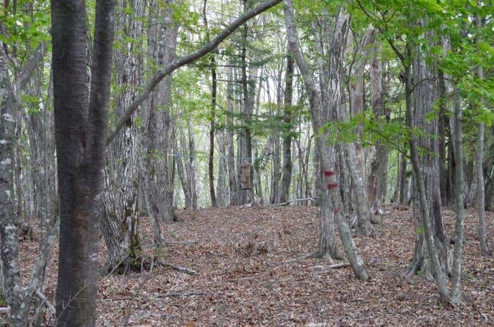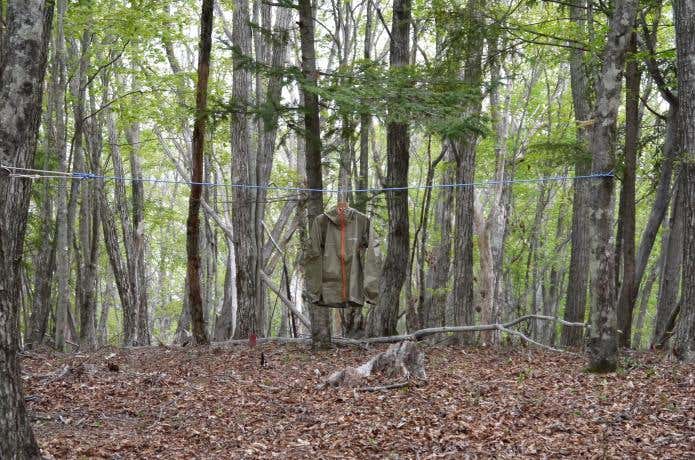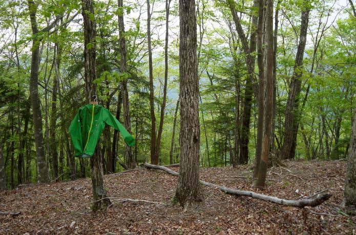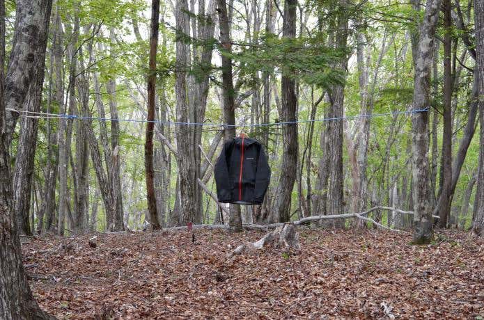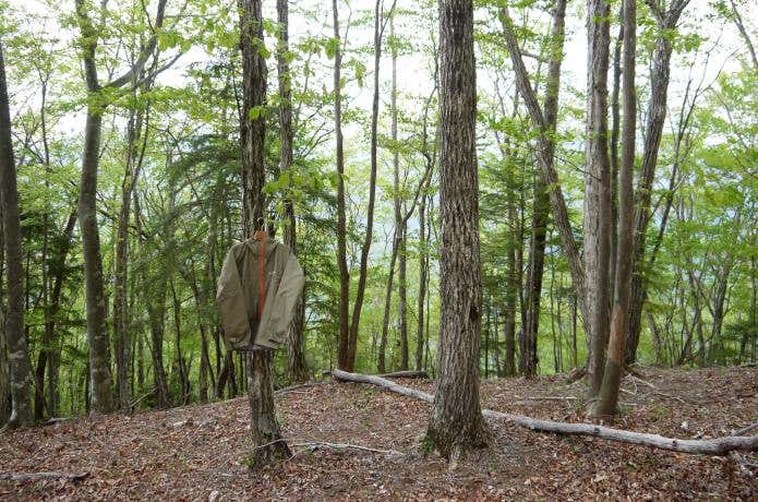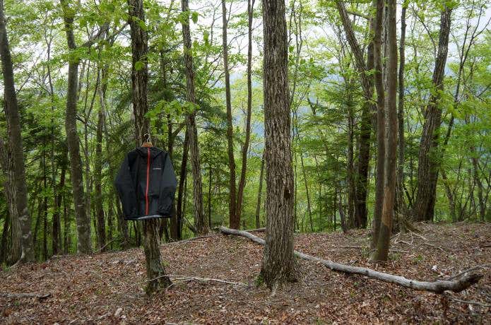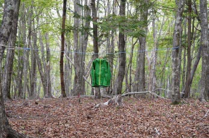 吊していることを知らなければ、ベージュのジャケットを見つけることを難しいでしょう。このテストしていて気づいたのですが、森の中は葉っぱの緑や秋の葉の赤や黄色よりも、むしろ落ち葉や木の幹の茶系、岩のグレー系の色に溢れた世界が多いんです。