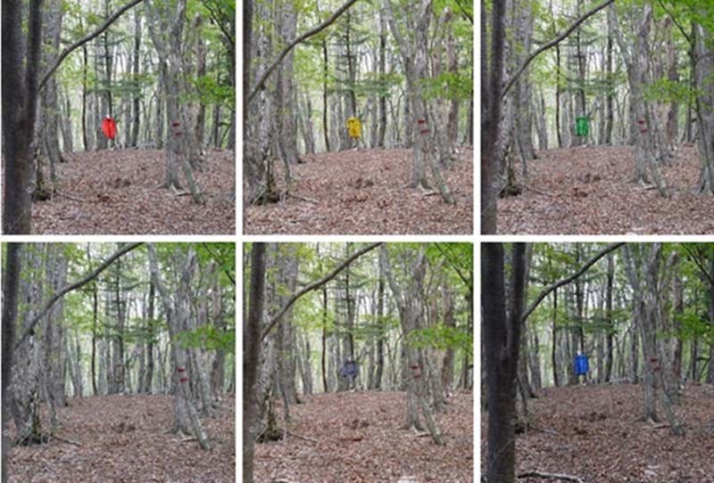 明るい緑も案外よく目立ったり、青は自然界にあまりない色なので違和感を感じたりということもわかりました。