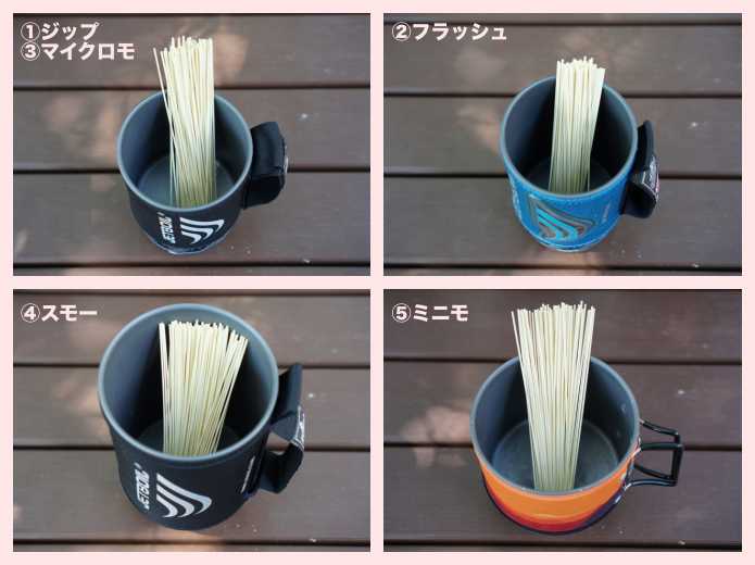 「②フラッシュ」と「④スモー」はほぼ完全に麺が収まりました。「⑤ミニモ」も麺が飛び出していますが、クッカーの直径が広いので、カトラリー で麺をすくいやすく食べやすそうです。
