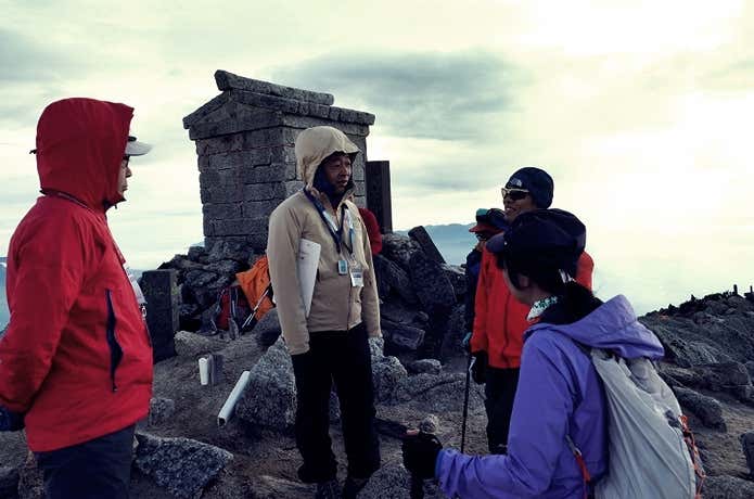 山頂では、動脈酸素濃度計にて登山者のメディカルチェックを実施。 医学的アドバイスの実施や質疑応答、および調査のためのアンケート記入など、山頂滞在時間はおよそ3時間にも及びます。
