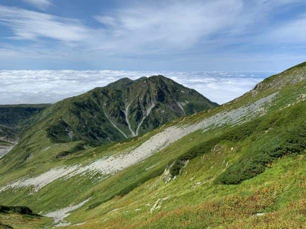 《5》左側の大日連峰より高い位置まで登ってくると、別山乗越まであと少し。