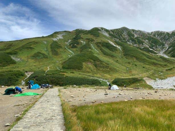 《7》別山乗越から剱沢へは、約40分の緩やかな下り坂。最初にキャンプ指定地に到着します。