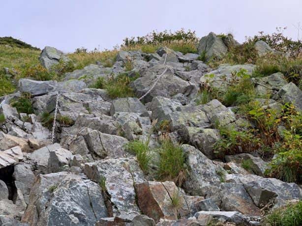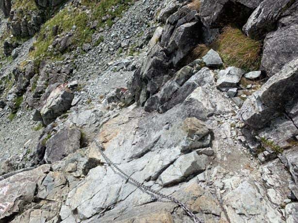 《14》斜度の緩い岩場なので、鎖に頼り過ぎないで通過してみましょう。
