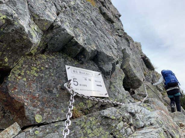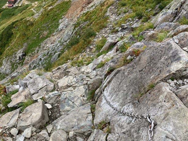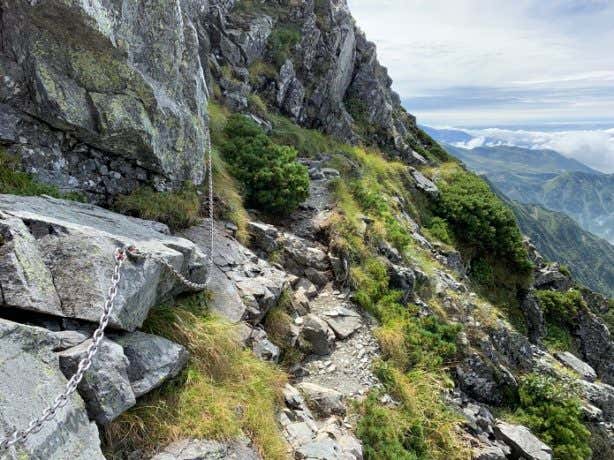 《29》第5の鎖場。右側は滑落すると大事故になる切り立った岩壁なので、鎖にしっかり掴まって進みましょう。