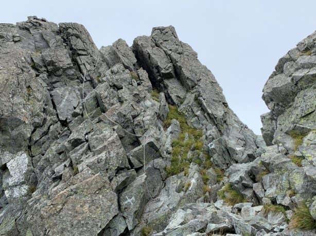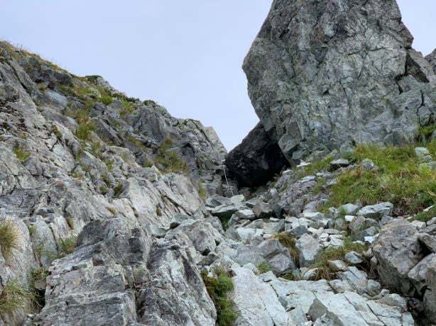 《36》いよいよ第9の鎖場・カニノタテバイ。上部からの落石や転落者の直撃を受けないように左下の岩陰に設けられた鎖の取付きで、順番を待ちましょう。