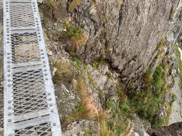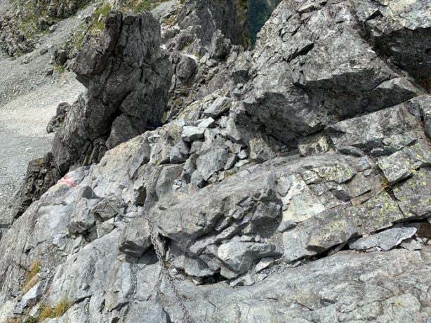 《44》最初の足場が目視できず、恐怖心を感じる場所です。鎖にしっかり掴まって思い切って岩から身体を離して足場を探すと、右足を置くのに丁度良い岩角が見つかるはずです。