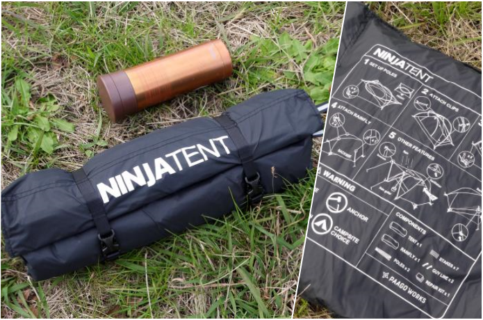 テントの収納袋というと巾着袋か圧縮袋がほとんど。実用的ではあるけれど、遊び心をくすぐるようなものではなく、味気ない。でもニンジャテントは、遊び心満載です。