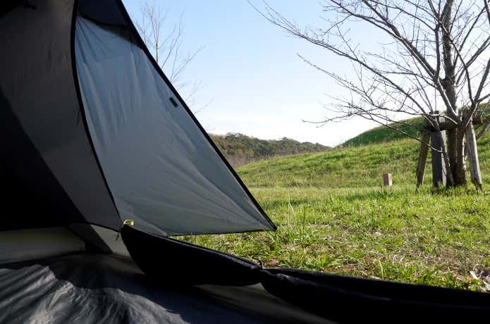 ちなみに撮影時は、近くに木があったので細引きを木に結んでパネルを上げましたが、トレッキングポールを柱にして上げることもできます。