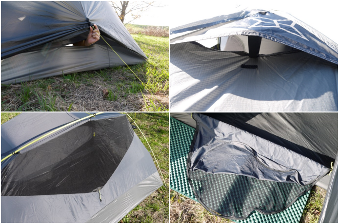 前後の大型メッシュパネルやベンチレーションを備えていますが、特筆すべきは、背面に設けられたジッパーから手を出して、テント内に居ながらフライシートをたくし上げ、換気を促進できるギミック。面白すぎます。