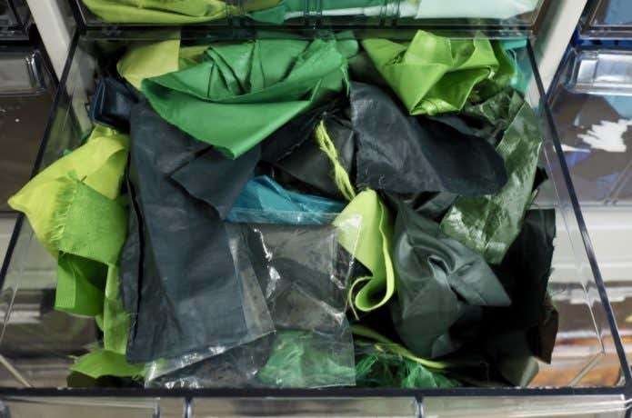 グリーンの引き出しを開けてみると、「何色ものグリーンの布」があふれています。よく見ると、格子の大きさにも微妙な違いがあります。