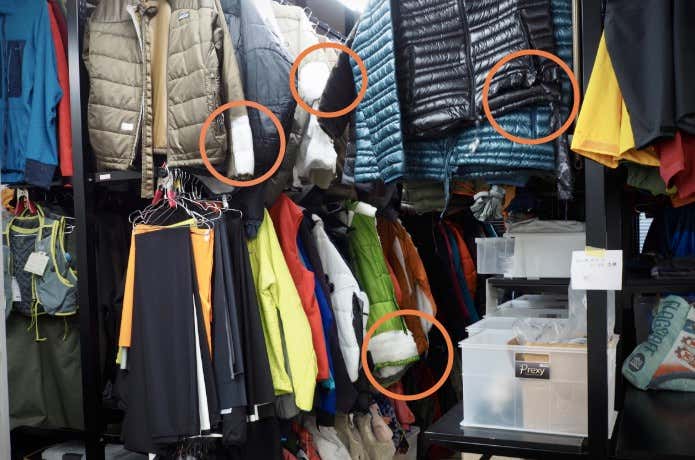 工房の奥に行くと、ずらりとかけられたパタゴニアのウェアが。生地が破けていたりと◯の部分が傷んでいるので、修理待ちかな?と思いましたが、実は違います。